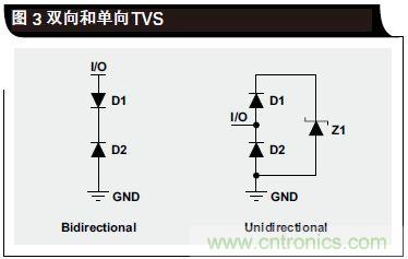 立即沿這條通路接地。在單向 TVS 情況下,只要 D2 和Z1 都不進(jìn)入其擊穿區(qū)域,則電壓信號(hào)會(huì)在接地電壓以上擺動(dòng)。當(dāng)正ESD電擊擊中I/O線路時(shí),D1變?yōu)檎蚱?,而Z1 先于 D2 進(jìn)入其擊穿區(qū)域;通過 D1 和 Z1 形成一條接地通路,從而讓 ESD 能量得到耗散。當(dāng)發(fā)生負(fù)ESD 事件時(shí),D2 變?yōu)檎蚱?,ESD能量通過 D2接地通路得到耗散。由于 D1 和 D2 尺寸可以更小、寄生電容更少,單向二極管可用于許多高速應(yīng)用;D1 和 D2 可以“隱藏”更大的齊納二極管 Z1(大尺寸的原因是處理擊穿區(qū)域更多的電流)。