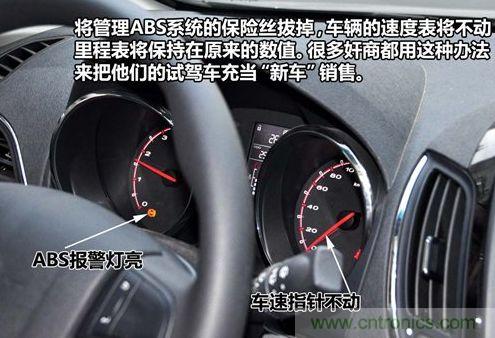當您新購買車的時候發(fā)現(xiàn)車輛的里程表和車速表不工作時要注意了,因為很可能是奸商把您車輛管理ABS泵的保險絲給拆下來了,這樣車輛還能正常開但里程數不增加,而這也是很多奸商翻新試駕車后當新車賣的常用手段。