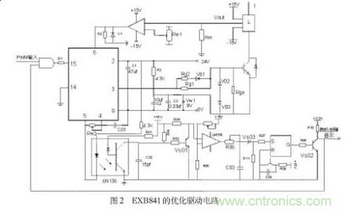如圖2所示,用外接8V穩(wěn)壓管Vw1代替驅(qū)動芯片內(nèi)部的穩(wěn)壓管Vz2,在穩(wěn)壓管兩端并聯(lián)了兩個電容值分別為105μf和0.33μf的去耦濾波電容。為防止柵極驅(qū)動電路出現(xiàn)高壓尖峰,在柵射極間并聯(lián)了反向串聯(lián)的16V(V02)和8V(V03)穩(wěn)壓二極管。為了改善控制脈沖的前后沿陡度和防止震蕩,減小IGBT 集電極的電壓尖脈沖,需要在柵極串聯(lián)電阻Rg。柵極串連電阻Rg要恰當(dāng),Rg過小,關(guān)斷時間過短,關(guān)斷時產(chǎn)生的集電極尖峰電壓過高;Rg過大,器件的開關(guān)速度降低,開關(guān)損耗增大。優(yōu)化電路采用了不對稱的開啟和關(guān)斷方法。在IGBT開通時,EXB841的3腳提供+16V的電壓,電阻Rg2經(jīng)二極管Vd1和Rg1并聯(lián)使Rg值較小。關(guān)斷時,EXB841內(nèi)部的V5導(dǎo)通,3腳電平為0,優(yōu)化驅(qū)動電路在IGBT的E極提供-8V電壓,使二極管V01截止,Rg= Rg1具有較大值。并在柵射極間并聯(lián)大電阻,防止器件誤導(dǎo)通。