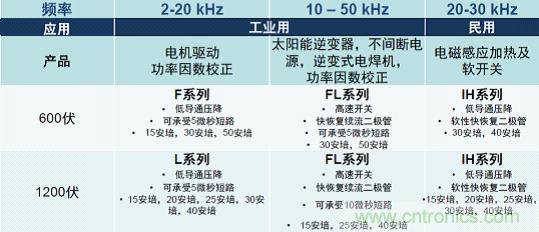 安森美半導體提供完善的IGBT產(chǎn)品系列,可以根據(jù)頻率、應用和電壓進行分類 (表1),不同產(chǎn)品有不同的特性和應用范圍。