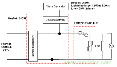 2Pro AC 器件一個(gè)常見(jiàn)的應(yīng)用是 LED 照明,其雷擊的保護(hù)要求都小于 2kV surge,2Pro AC 正好可以防護(hù) 2kV 的雷擊。下圖是不久前網(wǎng)友調(diào)試的一塊客戶 LED 電路板示意圖,雷擊要求是 2kV,把 2Pro AC 放置于 LED lighting 電路輸入端,再加上雷擊波形發(fā)生器和交流耦合。