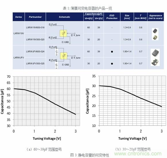 薄膜可變電容器的產品陣容如表1所示。1.3×0.9mm尺寸的LXRW19V系列、1.95×1.4mm尺寸的LXRWJFV系列已經(jīng)產品化。