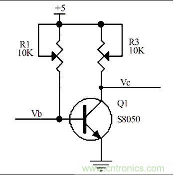 2、當(dāng)我們調(diào)節(jié)可調(diào)電阻,R1,使R1=4.3K時,通過歐姆定律我們可以計算得到,Ib=(5-0.7)/4.3K=1mA,那我們就可以計算出IC=Hfe*Ib=10mA,假如這個時候我調(diào)節(jié)R3,使R3=1K歐姆,通過計算我們可以得到Vc=5-(10mA*1K)=-5V,回出現(xiàn)-5V嗎,當(dāng)然不會,因為沒有負(fù)壓,所以Vc的電壓會停留在0V,那這個時候我們再來看下Ic到底是多少?