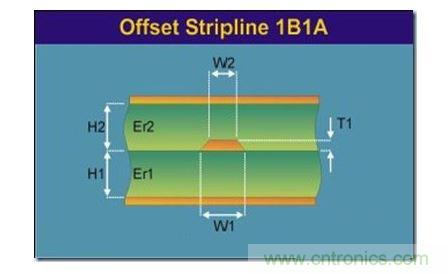 帶狀線是置于兩個參考平面之間的帶狀導(dǎo)線,如下圖所示,H1和H2代表的電介質(zhì)的介電常數(shù)可以不同。