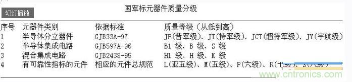 元器件的質量等級是指元器件裝機使用之前,按產(chǎn)品執(zhí)行標準或供需雙方的技術協(xié)議,在制造、檢驗及篩選過程中對其質量的控制等級。質量等級越高,其可靠性等級就越高。