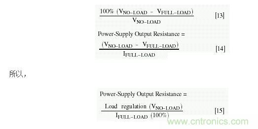 利用[12]式,可計(jì)算出RBISTABLE為0.320Ω。方程[9]的圖形表明,電源效率隨著RS的增加而跌落,在RS = RBISTABLE時(shí)跌落達(dá)20%。注意:該結(jié)論并不具有普遍性,對(duì)于每個(gè)應(yīng)用,必須分別進(jìn)行計(jì)算。RS的來(lái)源之一,是所有電源無(wú)法避免的、有限的輸出電阻,它可通過負(fù)載調(diào)整來(lái)確定,后者通常定義為: