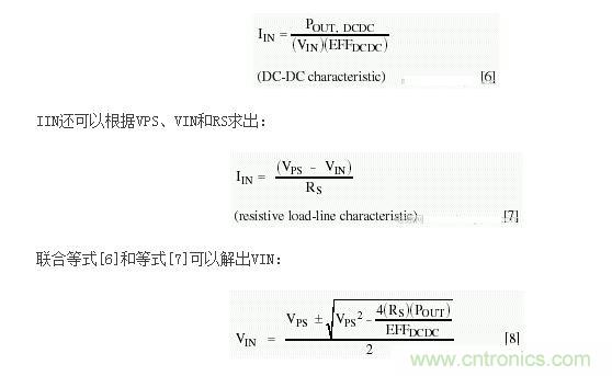 從該方程很容易得到能量損耗,并且圖3分析曲線中的有關(guān)參數(shù)也可以從中得到。舉例來(lái)說(shuō),如果串聯(lián)電阻(RS)等于零,電阻負(fù)載線的斜率將會(huì)變?yōu)闊o(wú)窮大。那么負(fù)載線就成為一條通過VPS的垂直線。在此情況下,VIN+ = VPS,效率為100%。隨著RS從0Ω增加,負(fù)載線繼續(xù)通過VPS,但越來(lái)越向左側(cè)傾斜。同時(shí),VIN+和VIN-匯聚于VPS/2,這也是50%效率點(diǎn)。當(dāng)負(fù)載線相切于I-V曲線時(shí),方程[8]只有一個(gè)解。對(duì)于更大的RS,方程沒有實(shí)數(shù)解,DC-DC轉(zhuǎn)換器將無(wú)法正常工作。