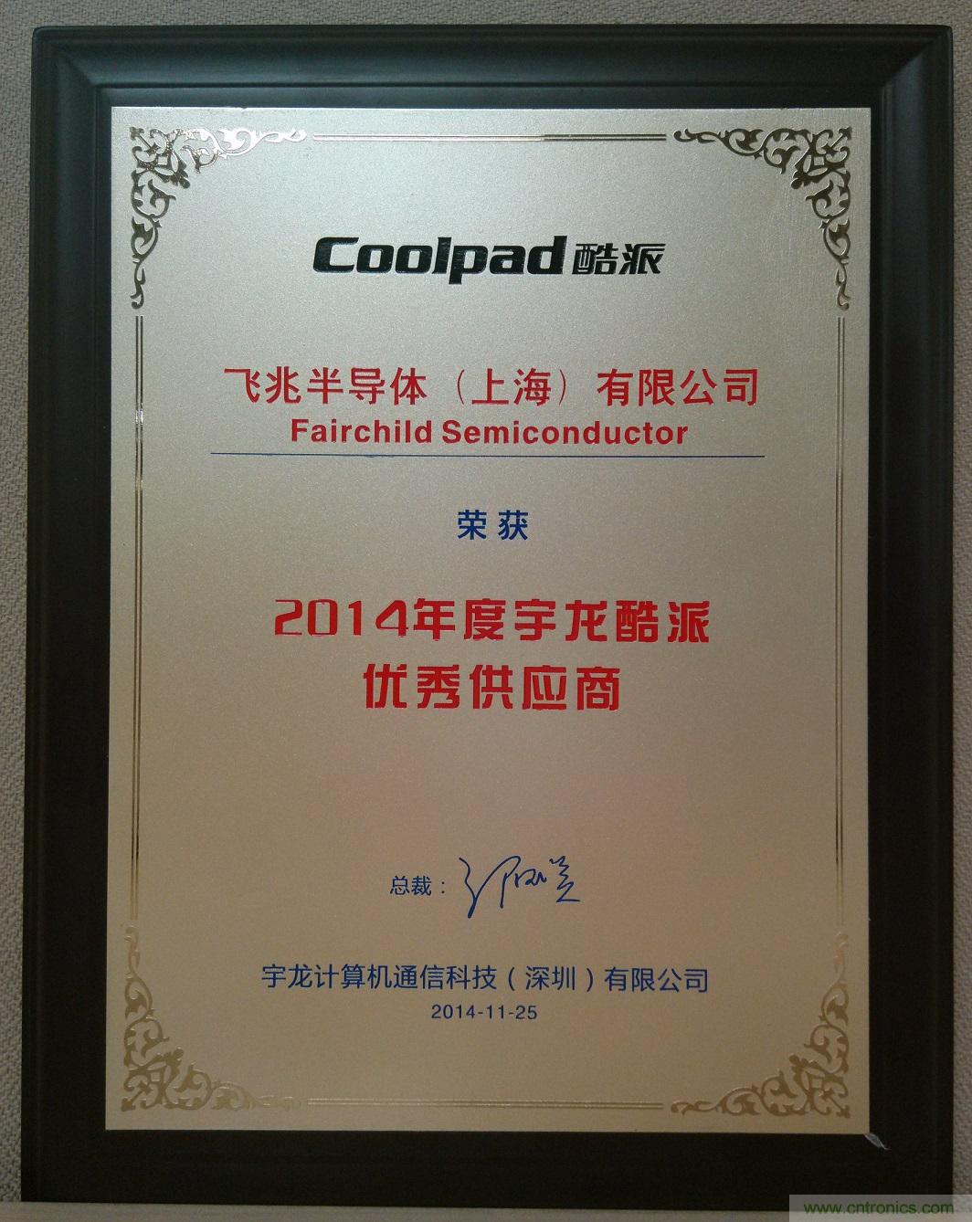 最佳供應商獎旨在表彰Fairchild為宇龍酷派品牌提供一流產品、杰出服務和強大的技術支持。宇龍酷派品牌是中國領先的智能手機之一。Fairchild的準時交貨為 2014 上半年宇龍大舉進軍 4G LTE 智能手機市場提供了大力支持。