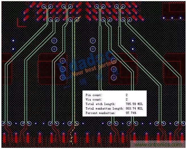 一個朋友前不久設計了一款28G-VSR協(xié)議的板子接光模塊,光口連接器采用的是CFP2的表貼連接器,由于PHY芯片到光口連接器距離很短,所以當初設計的時候就直接從芯片打孔連線過來,沒有經過任何特殊的處理,最后板上走線總長度約800mil,如下圖一所示。