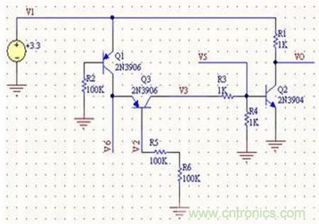 若Q1和Q3基極同時為低時,Q2導(dǎo)通而使得VO為0造成晶振停振關(guān)閉處理器。我們分析R3和R4(實際電路470K)使得Q2和Q3處于飽和態(tài);Q3為Q1集電極負載,調(diào)整R5阻值時可控制Q1處于飽和態(tài)或放大態(tài)。要使Q2基極導(dǎo)通必須使Q1提供足夠大電流才滿足條件,只有Q1處于放大態(tài)才滿足條件;