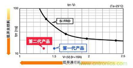 圖1.SiC肖特基二極管與硅材質(zhì)FRD特性比較(650V/10A級(jí))