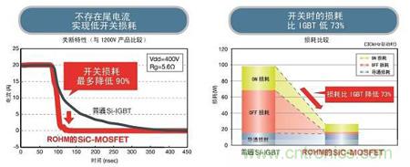 圖2. 普通Si-IGBT和ROHM的SiC-MOSFET的開(kāi)關(guān)損耗比較