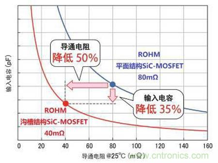 圖5. 溝槽結(jié)構(gòu)SiC-MOSFET的導(dǎo)通電阻、輸入電容特性