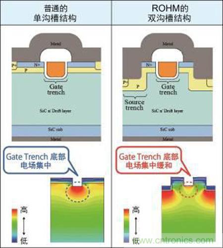 溝槽結(jié)構(gòu)因在SiC-MOSFET中采用,可有效降低導(dǎo)通電阻而備受關(guān)注。但為了確保元器件的長(zhǎng)期可靠性,需要設(shè)計(jì)能夠緩和Gate Trench部分(通過(guò)有無(wú)施加電壓來(lái)控制MOSFET元件的開(kāi)關(guān)ON/OFF的部位)產(chǎn)生的電場(chǎng)的結(jié)構(gòu)。因?yàn)楫?dāng)僅在Gate Trench部位采用溝槽結(jié)構(gòu)時(shí),Gate Trench結(jié)構(gòu)底部電場(chǎng)集中,很難確保元器件的可靠性。ROHM通過(guò)采用獨(dú)創(chuàng)的結(jié)構(gòu),緩和了Gate Trench結(jié)構(gòu)底部的電場(chǎng)集中現(xiàn)象,從而成功實(shí)現(xiàn)了采用溝槽結(jié)構(gòu)的SiC-MOSFET的量產(chǎn)(圖6)。