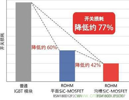 ROHM首先實(shí)現(xiàn)了采用量產(chǎn)中的溝槽結(jié)構(gòu)SiC-MOSFET元件的“全SiC”功率模塊的產(chǎn)品化。該產(chǎn)品的額定電壓為1200V,額定電流為180A,內(nèi)部電路為半橋配置。與同等額定水平的Si-IGBT功率模塊產(chǎn)品相比,其顯著優(yōu)勢(shì)當(dāng)然不必言說(shuō),即使與量產(chǎn)中的1200V/180A的SiC-MOSFET模塊相比,其開(kāi)關(guān)損耗也大幅降低(圖7)。
