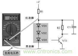 檢測這一電路中的3只二極管最為有效的方法是測量二極管上的直流電壓,如圖所示是測量時接線示意圖。如果測量直流電壓結(jié)果是1.8V左右,說明3只二極管工作正常;如果測量直流電壓結(jié)果是0V,要測量直流工作電壓+V是否正常和電阻R1是否開路,與3只二極管無關(guān),因為3只二極管同時擊穿的可能性較??;如果測量直流電壓結(jié)果大于1.8V,檢查3只二極管中有一只開路故障。