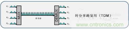 時(shí)分復(fù)用是一種通過(guò)使用越來(lái)越小的時(shí)間增量來(lái)傳輸更多的數(shù)據(jù)的方式,并且將較低數(shù)據(jù)率的信號(hào)復(fù)用進(jìn)較高速度的復(fù)合信號(hào)中。通過(guò)時(shí)分復(fù)用,較低速度的電信號(hào)交錯(cuò)在時(shí)間中,并在較快的復(fù)合光路上傳輸。因此,所得的較高數(shù)據(jù)速率將是單個(gè)輸入速率的數(shù)倍。