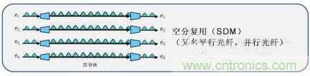 空分復(fù)用,通常被稱為并行光纖,是一種通過(guò)在復(fù)合鏈路中增加一條或多條光纖來(lái)增加一個(gè)或多個(gè)通道的方式。在這種情況下,一個(gè)通道實(shí)際上就是另一股光纖。這是上述時(shí)分復(fù)用通道的一個(gè)替代方案,在時(shí)分復(fù)用中,信號(hào)以按時(shí)間合并在同一條光纖上。行業(yè)中有很多應(yīng)用這種技術(shù)的例子。例如,40G SR4通過(guò)使用四通道或光纖,在多模光纖上提供40Gbps的速率。也就是在每個(gè)方向上有四個(gè)通道。這也正是“SR4”中4的含義,4個(gè)通道,每個(gè)10Gbps。