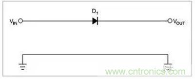 圖1.一只串聯(lián)二極管保護系統(tǒng)不受反向極性影響,二極管有0.7V的壓降。