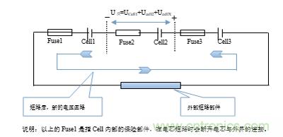 說明:以上的Fuse1是指Cell內(nèi)部的保險(xiǎn)部件,在電芯短路時(shí)會斷開電芯與外界的連接。 Fuse1Cell1Fuse2Cell2Fuse3Cell3+_U反=UCell1+Ucell2+UcellX外部短路部件短路后,新的電壓回路。