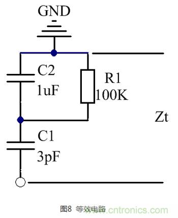 不管正向還是反向接入法,其等效電路都如圖8所示。我們假設二極管的節(jié)電容為3pF,附件功能模塊寄生總電容1uF。如果電阻足夠大,那么可以忽略,此時就是兩個電容串聯,和電阻并聯類似,CT=C1*C2/(C1+C2)≈C1(C2較大)。大電容就算變化很大,串聯總電容幾乎等于小電容,即3pF,有效減小接入電容。