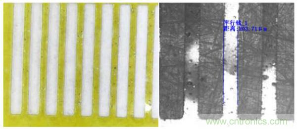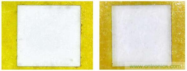 圖2.紫外激光 PI 膜開(kāi)窗(左圖為 0.5mil 厚,右圖為 1mil厚)