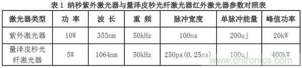 皮秒光纖激光器是在超快激光基礎(chǔ)上開(kāi)發(fā)出的新一代激光器,尤其是近年來(lái)光纖器的研制成功,標(biāo)志著激光技術(shù)的一次飛躍進(jìn)步,與固體納秒激光相比,皮秒光纖激光器具有以下優(yōu)點(diǎn):1.激光脈沖寬度更窄,僅為 10^-12S,從上述材料吸收激光能量轉(zhuǎn)化為熱能的擴(kuò)散距離公式可知,這將大大減小激光加工材料時(shí)的熱擴(kuò)散距離,降低激光對(duì)材料的熱損傷;2.因脈沖寬度變窄,激光單脈沖峰值功率成倍增加,提升了激光加工材料的能力;3.光纖激光器以細(xì)小的光纖作為激光的傳輸和放大介質(zhì),與固體放大結(jié)構(gòu)相比,不僅工作穩(wěn)定,免除了周期性的調(diào)校工作,降低了維護(hù)成本,而且結(jié)構(gòu)小巧,制造成本相對(duì)較低。表1是量澤激光公司研制的光纖器與目前市面上主流的納秒級(jí)固體紫外激光器的參數(shù)對(duì)照: