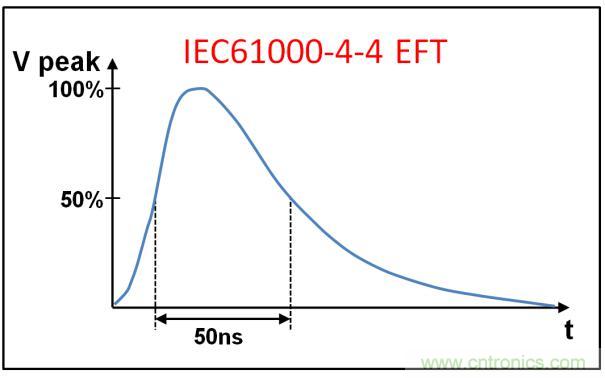 電快速瞬變(EFT)測試的是,將大量極快的瞬變脈沖耦合到信號線上,系統(tǒng)與外部開關電路關聯(lián)的瞬變干擾,這類電路能夠以容性方式耦合至通信端口。EFT的纏上包括繼電器和開關觸點抖動,或者因為感性或容性負載切換而產(chǎn)生的瞬變, 而所有這些在工業(yè)環(huán)境中都很常見。EC 61000-4-4中定義的 EFT測試,就是去模擬這些事件產(chǎn)生的干擾。