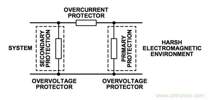 所有上述三個元件協(xié)同工作,與系統(tǒng)輸入/輸出配 合,一起針對高電壓大電流瞬變?yōu)橄到y(tǒng)提供系統(tǒng)級保護。