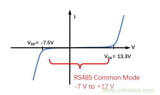 重要的是要確保TVS的擊穿電壓在受保護引腳的正常工作范圍之外。CDSOT23-SM712的獨有特性是具有+13.3 V和–7.5 V的非對稱擊穿電壓,與RS-485芯片ADM3485E的+12 V至–7 V的收發(fā)器共模范圍相匹配,從而提供最佳保護,同時最大限度地減小對RS-485收發(fā)器的過壓應力。
