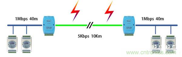 傳導(dǎo)防護(hù)主要是在傳輸線上進(jìn)行的。CAN總線的數(shù)據(jù)傳輸介質(zhì)一般為雙絞線,它主要的作用是抗低共模干擾,但是在面對浪涌、雷擊等情況時不僅沒有防護(hù)作用,反而易造成節(jié)點設(shè)備的損壞。因此,具備室外環(huán)境、長傳輸距離、多節(jié)點設(shè)備特點的總線一般都要加隔離防護(hù)功能的網(wǎng)橋、