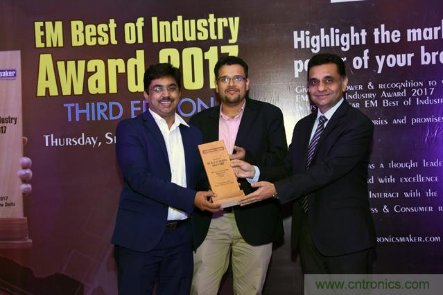 圖片說明:印度銷售經(jīng)理Bharat Kapoor(左)以及印度和南非現(xiàn)場應用經(jīng)理Navneet Vinaik(中)接受EM行業(yè)最佳獎的“最佳電路保護組件獎”。