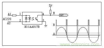 過零點(diǎn)檢測(cè)可采用硬件實(shí)現(xiàn),在硬件設(shè)計(jì)中,可以增加如圖4 或圖5過零點(diǎn)的硬件檢測(cè)電路,通過在B端輸出為高電平時(shí)進(jìn)行按鍵狀態(tài)的判斷,以期在電磁輻射最小的時(shí)候?qū)τ|摸按鍵進(jìn)行檢測(cè)。