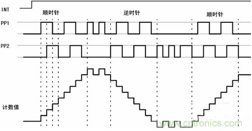 方向盤轉角傳感器的輸出為正交編碼脈沖。正交編碼脈沖包含兩個脈沖序列,有變化的頻率和四分之一周期(90°)的固定相位偏移,如圖1所示。通過檢測2路信號的相位關系可以判斷為順時針方向和逆時針方向,并據(jù)此對信號進行加/減計數(shù),從而得到當前的計數(shù)累計值,也即方向盤的絕對轉角,而轉角的變化率即角速度,則可通過信號頻率測出。另外,方向盤轉角傳感器有一個零位輸出信號,當方向盤在中間位置時,該信號輸出0V,否則輸出5V,通過該信號,可對絕對轉角進行在線校準。