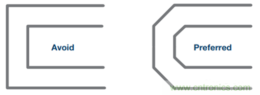 差分對(duì)布線(xiàn)時(shí),應(yīng)避免急轉(zhuǎn)彎(90°)(參見(jiàn)圖23)。