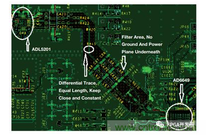 ADI公司接收器參考設(shè)計(jì)板(參見(jiàn)圖26)提供了差分濾波器PCB布局 的一個(gè)示例。這顯示了ADL5201和AD6649之間有一個(gè)五階濾波 器。AD6649是一款14位250 MHz流水線(xiàn)式ADC,具有非常好的SNR 性能。