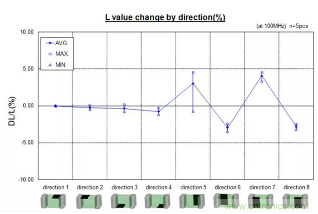 可以看出,標記點朝側(cè)面,感值變化較大,所以貼片時應(yīng)注意讓電感上的標記點朝上。