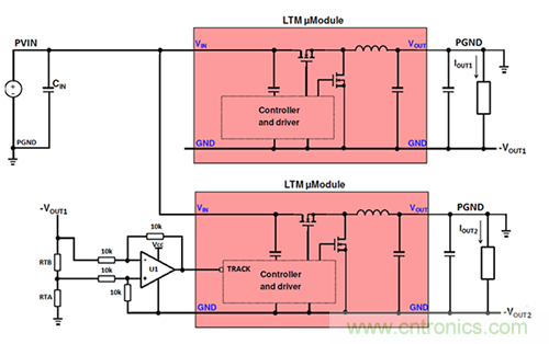 TRACK引腳輸入允許μModule穩(wěn)壓器通過將跟蹤信號(即,主μModule穩(wěn)壓器的輸出電壓軌的分壓版本)提供給從μModule穩(wěn)壓器的TRACK引腳來跟蹤另一電源軌的輸出電壓斜坡。每個(gè)μModule穩(wěn)壓器內(nèi)部控制器所看到的TRACK引腳電壓與其μModuleGND引腳相關(guān),但在需要配置兩個(gè)負(fù)輸出轉(zhuǎn)換器進(jìn)行跟蹤的應(yīng)用中,μModule穩(wěn)壓器的GND引腳可以處于不同的電位。主和從GND引腳電位差異意味著主設(shè)備提供的跟蹤信號不能直接施加到從設(shè)備的跟蹤引腳。在這些類型的應(yīng)用中,需要額外的考慮以確保從機(jī)相位能夠看到來自主機(jī)相位的正確參考的跟蹤信號。
