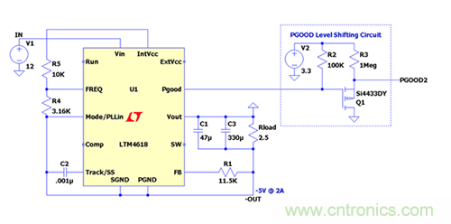 下面舉例說明在負(fù)輸出配置中使用LTM4618時(shí)PGOOD引腳電平轉(zhuǎn)換電路的設(shè)置。V IN = 12V,-V OUT = -5V @ 3A。
