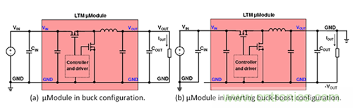 圖1.僅僅幾個(gè)連接變化將一個(gè)降壓μModule穩(wěn)壓器(a)轉(zhuǎn)換為一個(gè)負(fù)輸出穩(wěn)壓器(b)