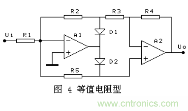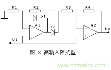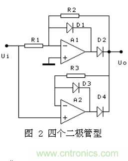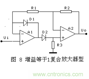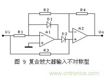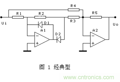 其它幾種,有的在D2導(dǎo)通的半周內(nèi),通過A2的復(fù)合實現(xiàn)A1的負反饋,對有些運放會出現(xiàn)自激. 有的兩個半波的輸入阻抗不相等,對信號源要求較高。