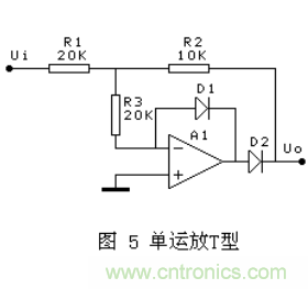 圖5 和 圖6 要求R1=2R2=2R3,增益為1/2,缺點是:當(dāng)輸入信號正半周時,輸出阻抗比較高,可以在輸出增加增益為2的同相放大器隔離.另外一個缺點是正半周和負半周的輸入阻抗不相等,要求輸入信號的內(nèi)阻忽略不計。