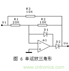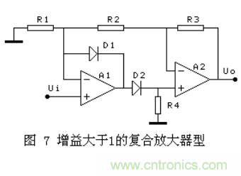 圖7正半周,D2通,增益=1+(R2+R3)/R1;負半周增益=-R3/R2;要求正負半周增益的絕對值相等,例如增益取2,可以選R1=30K,R2=10K,R3=20K