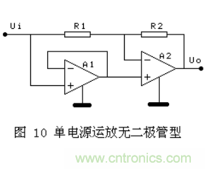圖10是利用單電源運放的跟隨器的特性設(shè)計的,單電源的跟隨器,當(dāng)輸入信號大于0時,輸出為跟隨器;當(dāng)輸入信號小于0的時候,輸出為0.使用時要小心單電源運放在信號很小時的非線性.而且,單電源跟隨器在負信號輸入時也有非線性。
