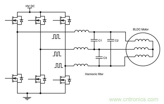 非極化薄膜電容器與串聯(lián)電感通常可集成在單個模塊內(nèi),這樣可構(gòu)成低通濾波器,用于衰減驅(qū)動器和逆變器交流輸出中的高頻諧波(如圖4)。這些越來越多地用于滿足系統(tǒng)EMC要求,并減小電纜和電機(jī)上與dV/dt相關(guān)的應(yīng)力,特別是在負(fù)載遠(yuǎn)離驅(qū)動單元時的情況。