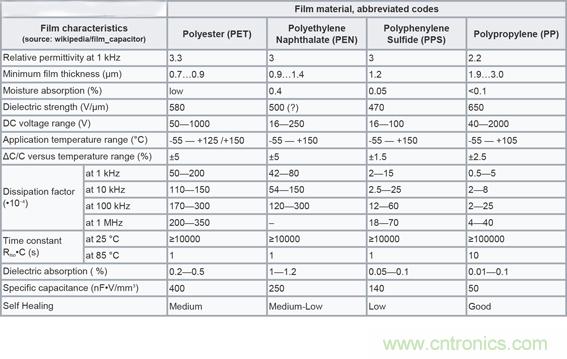 表1:常用薄膜電容器類型及其特性。