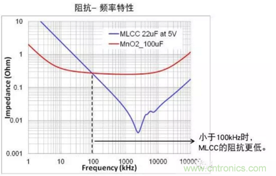 由上圖可知,大于100kHz頻率時(shí),與Ta電容器(MnO2) 100uF相比,盡管MLCC 22uF的靜電容量小,但其阻抗更小。這是因?yàn)镸LCC的ESR、ESL更小。