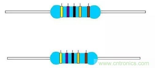 技巧2:棕色環(huán)是否是誤差標志的判別。棕色環(huán)既常用做誤差環(huán),又常作為有效數(shù)字環(huán)。常常在第一環(huán)和最末一環(huán)中同時出現(xiàn),使人很難識別誰是第一環(huán)。在實踐中可以 按照色環(huán)之間的間隔加以判別。比如對于一個五道色環(huán)的電阻而言,第五環(huán)和第四環(huán)之間的間隔比第一環(huán)和第二環(huán)之間的間隔要寬一些,據(jù)此可判定色環(huán)的排列順序。