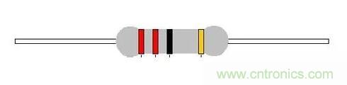 現(xiàn)在我們來認識四環(huán)電阻如何來進行讀數(shù)操作。首先,四環(huán)和五環(huán)的區(qū)別在于,少了一環(huán)為有效數(shù)學而已;其它的讀法差不多,按照上面的表格操作就好了,我們知道第一位顏色是紅色,依次為紅色,黑色,橙色。