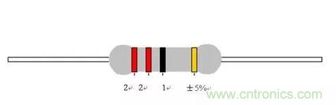 如:一個電阻第一環(huán)為紅、第二環(huán)為紅、第三環(huán)為黑、第四環(huán)為黑、第五環(huán)為棕色,則其阻值為:紅:2;紅:2;黑:0;黑:1倍;棕:±1%。